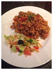 Garlicky, which was good and a strong tomato taste from the sauce but it didn’t look too appealling and was actually overcooked and stodgy – even for a risotto. Also came with a pointless salad.