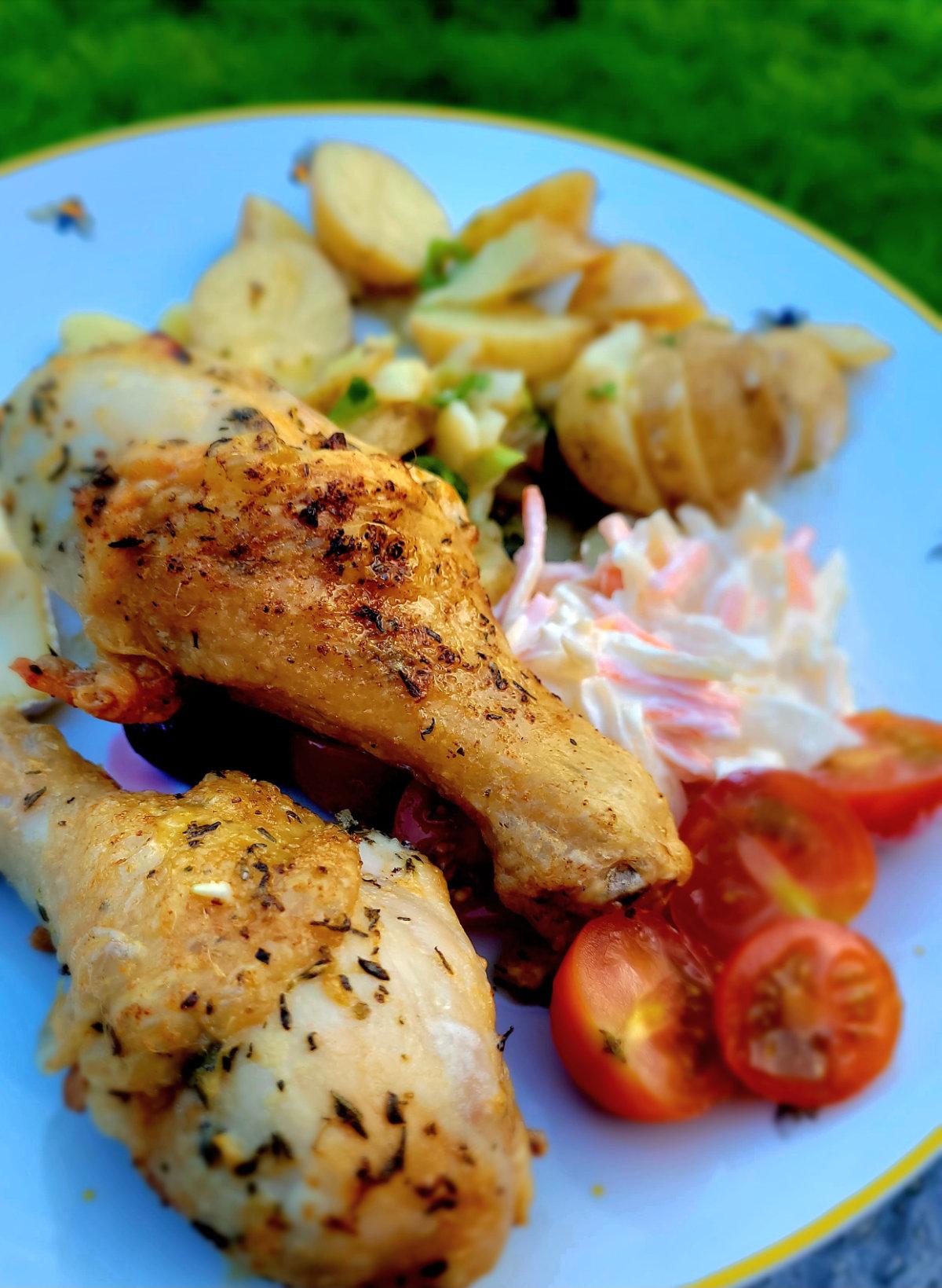 This is the kind of BBQ for me, put it together and stick it in the air fryer and relax with some wine. There’s no watching the chicken, worrying if it’s burned on the outside and raw on the inside. These chicken drumsticks are covered in a marinade and straight into the air fryer. Left to cook and then plated up. That easy.