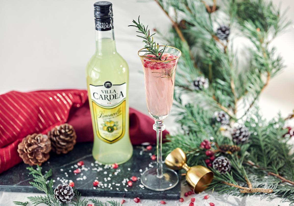 In a flute glass add the limoncello and cranberry juice, top with Prosecco. Garnish with floating pomegranate seeds and rosemary sprig