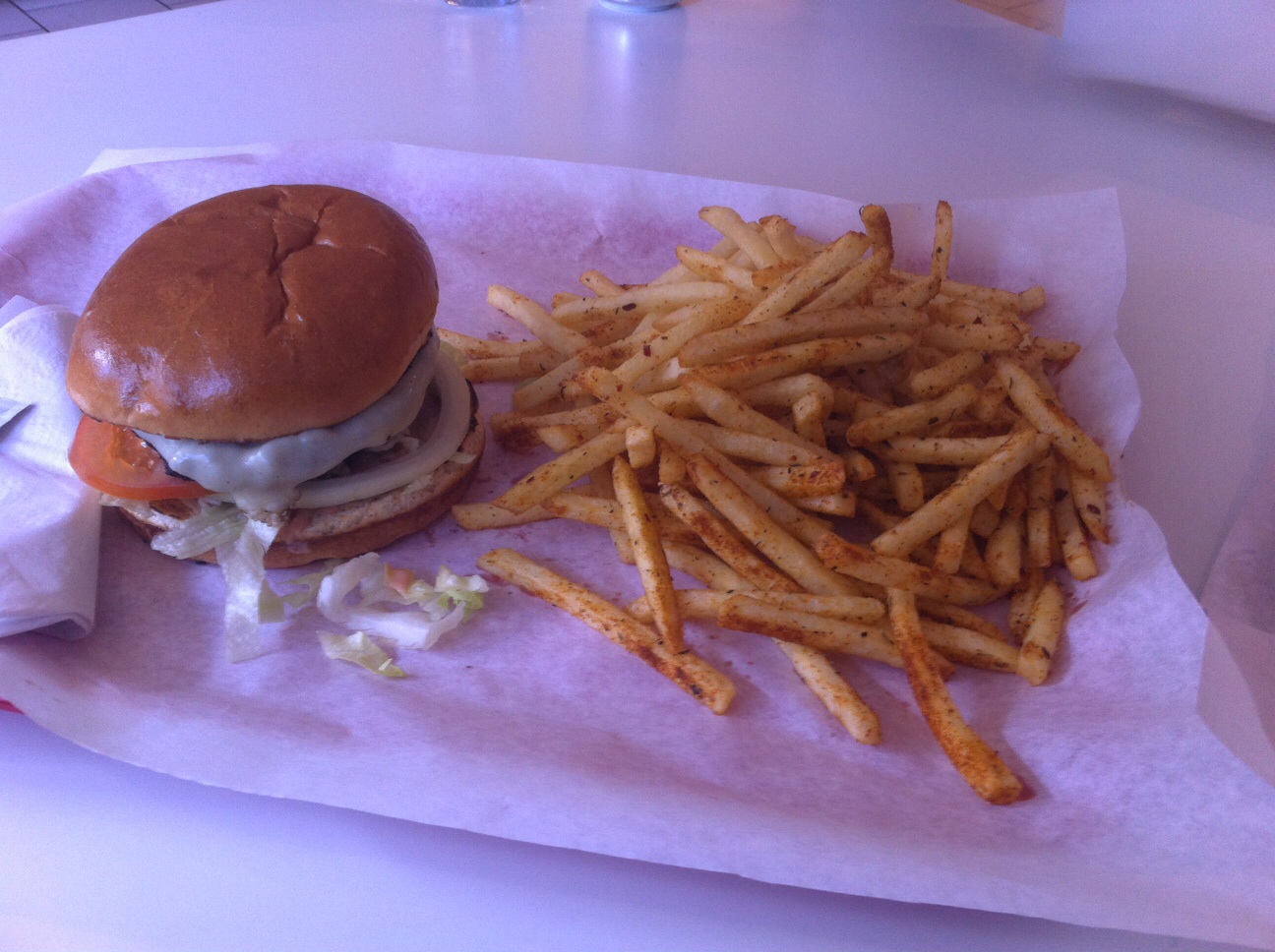 Charcoal-tinged burger, good size with fresh salad. Served with seasoned fries, which were well-seasoned (perhaps a bit too much) to pack a tingly punch.
