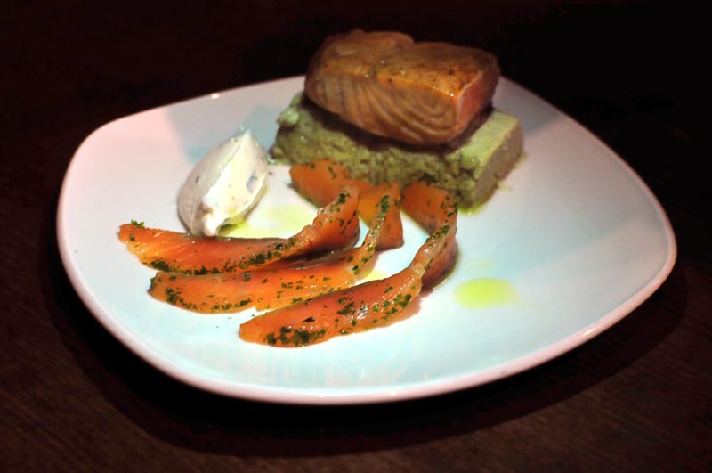 Dúo de salmon ahumado y marinado con pastel de puerros y crema de queso £6.90