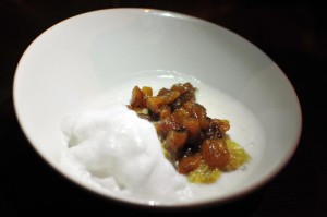 Sopa de coco con pina salteda, bizcocho al ron y espuma de coco £5.20