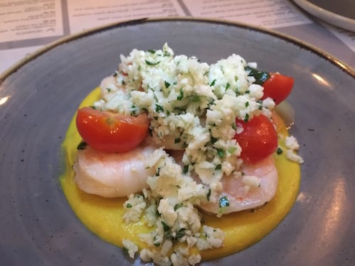 A creamy lightly curried sauce with little crisp pieces of cauliflower and enough purée to coat the plump prawns and add some extra flavour to the cous cous.