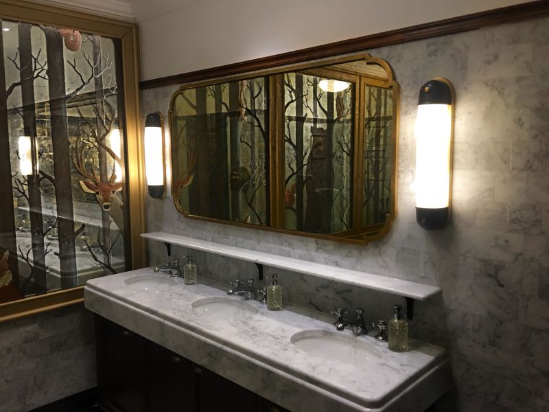 Before leaving, you must pay a visit to the loos! Look at that toilet, isn’t it stunning? In the ladies are individual cubicles with some serious Art Deco styling and pink toilet seats, but it’s not just the ladies’. Here is the woodland creatures-themed gents’ toilets.