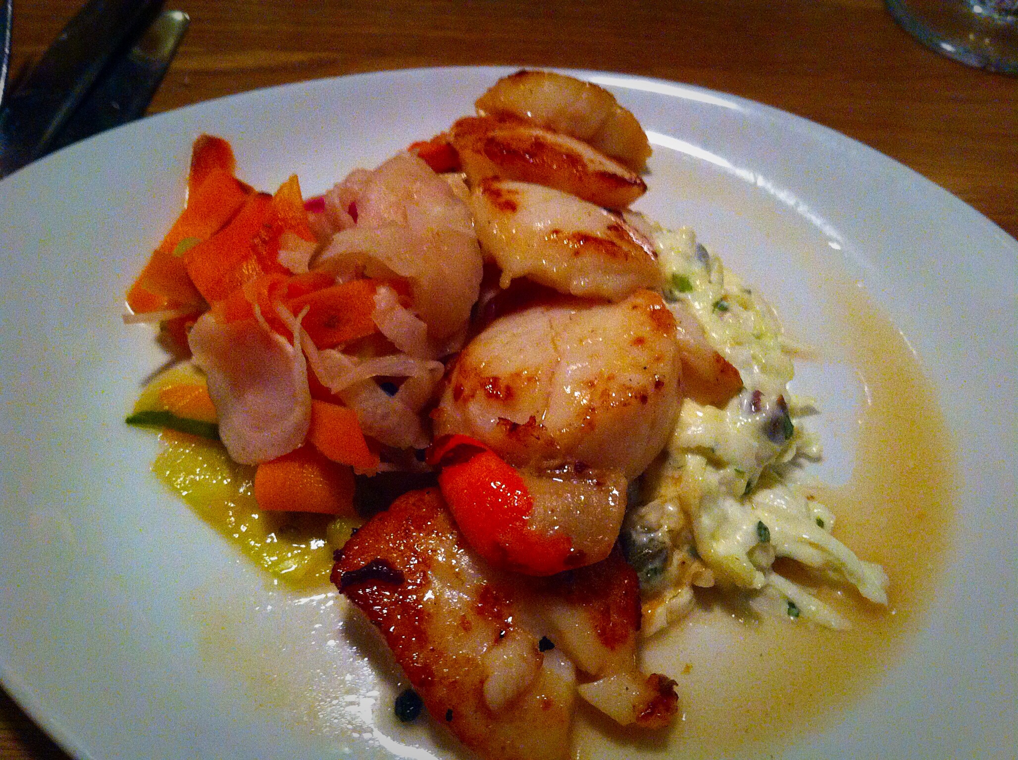 5 buttery, smooth scallops served with a slightly tangy selection of pickled vegetables and celeriac. The vegetables cut through the frying butter and livened up what can be a plain meaty shellfish.