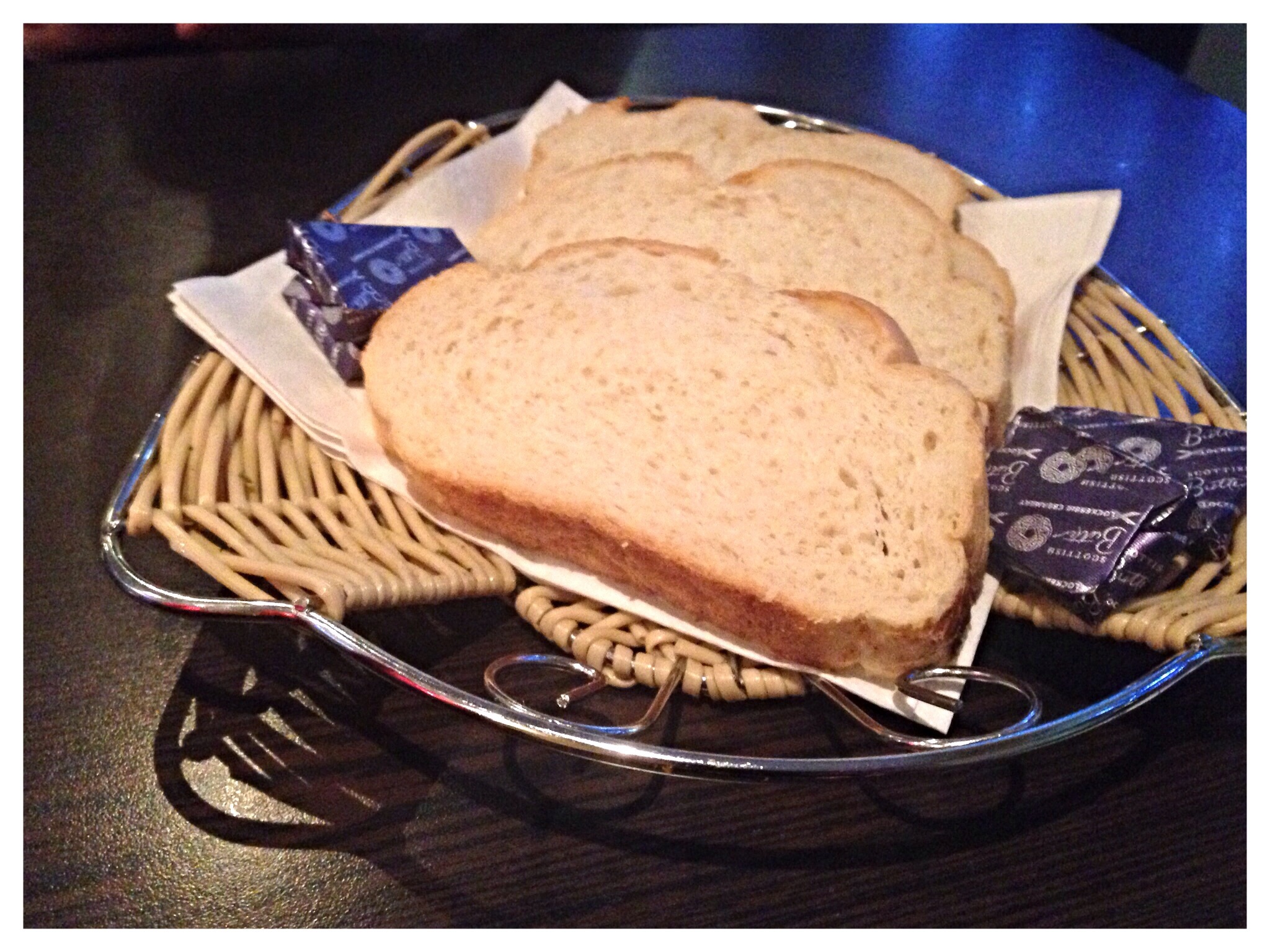 We opted for the former and 3 slices of chewy white bread arrived for us to fight over – or not as it was a bit stale, still at least it came with Lockerbie butter…So we asked for it to be toasted. Not a prob as it was whisked away…