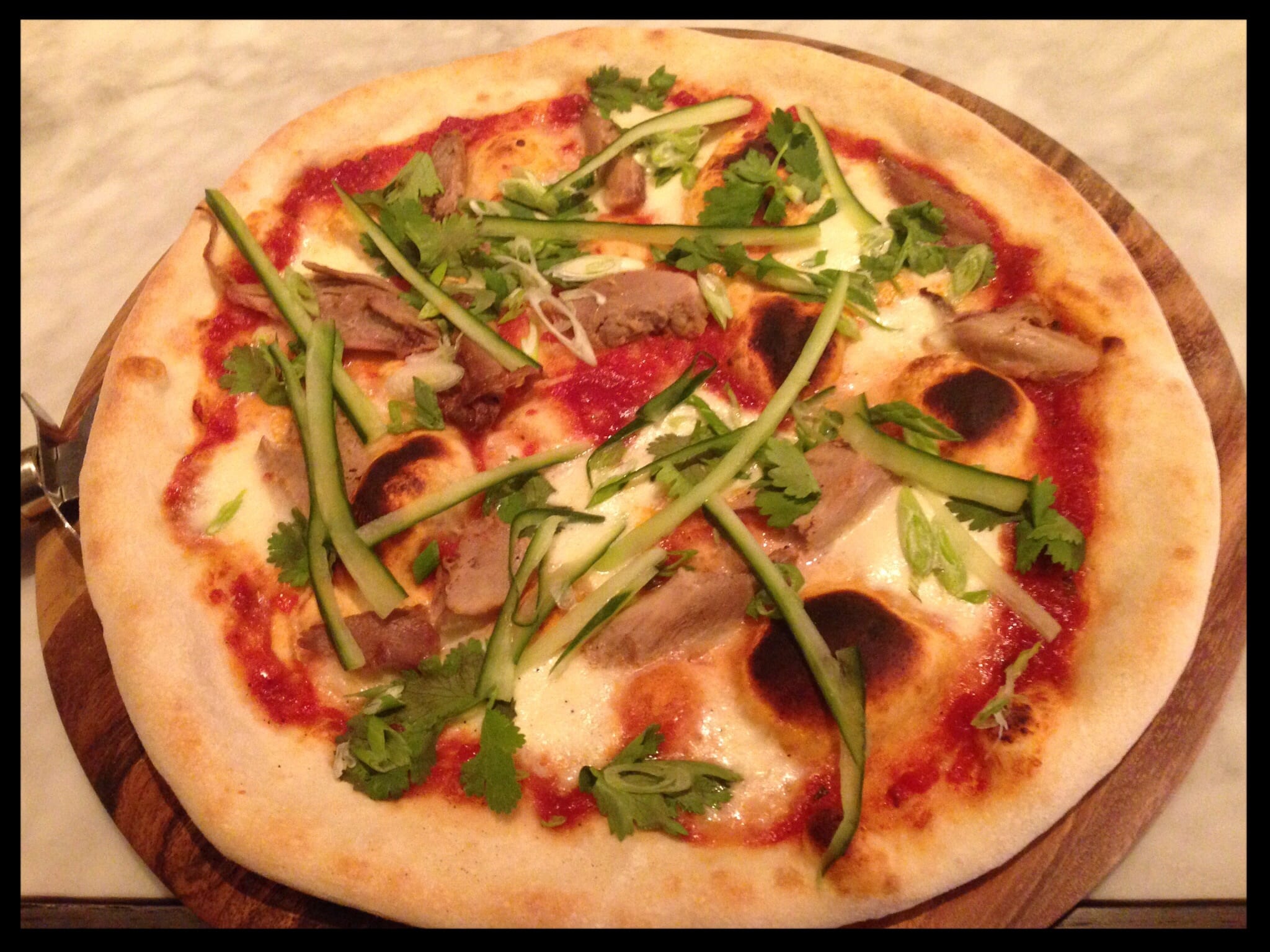 Peking Pizza, roasted crispy duck on a hoisin base with spring onion and coriander. £10.95
