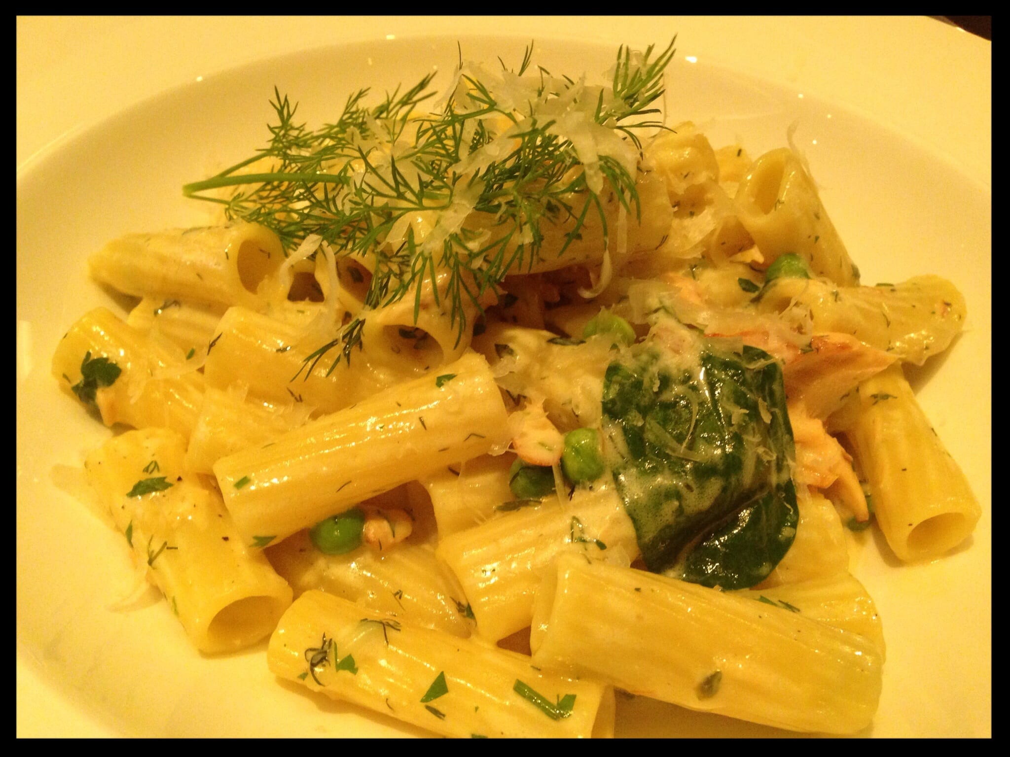 Smoked Salmon and Dill Rigatoni, tossed with cream, peas and spinach finished with fresh lemon. £11.95