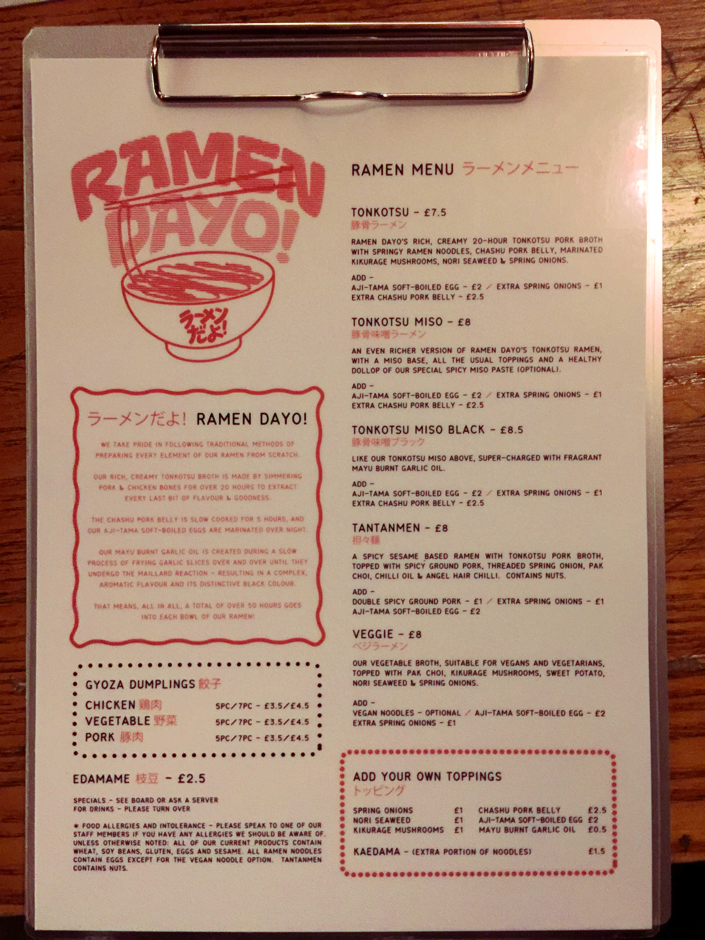 So, Ramen Dayo! was my introduction to tonkotsu. I now plan to return to work my way through the rest of the menu as it was surprisingly good and probably as close as you can get to eating ramen in Japan without leaving the country! My belly was full after two courses including two drinks, which cost a total of £20.25. Service was friendly and non-obtrusive but probably my main criticism is something really silly and that’s the constant squeaky gym-hall floor sounds from staff repeatedly walking across a particular bit of floor!