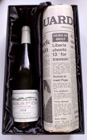 Once you have picked a date then you also have a choice of newspaper. We opted for the Guardian but then are plenty of others to pick from. Finally, pick your tipple. We’ve been drinking a lot of wine lately so the 75cl bottle of Chablis Premier Cru Wine seemed the ideal thing, but again there are other wines and spirits to select from.
