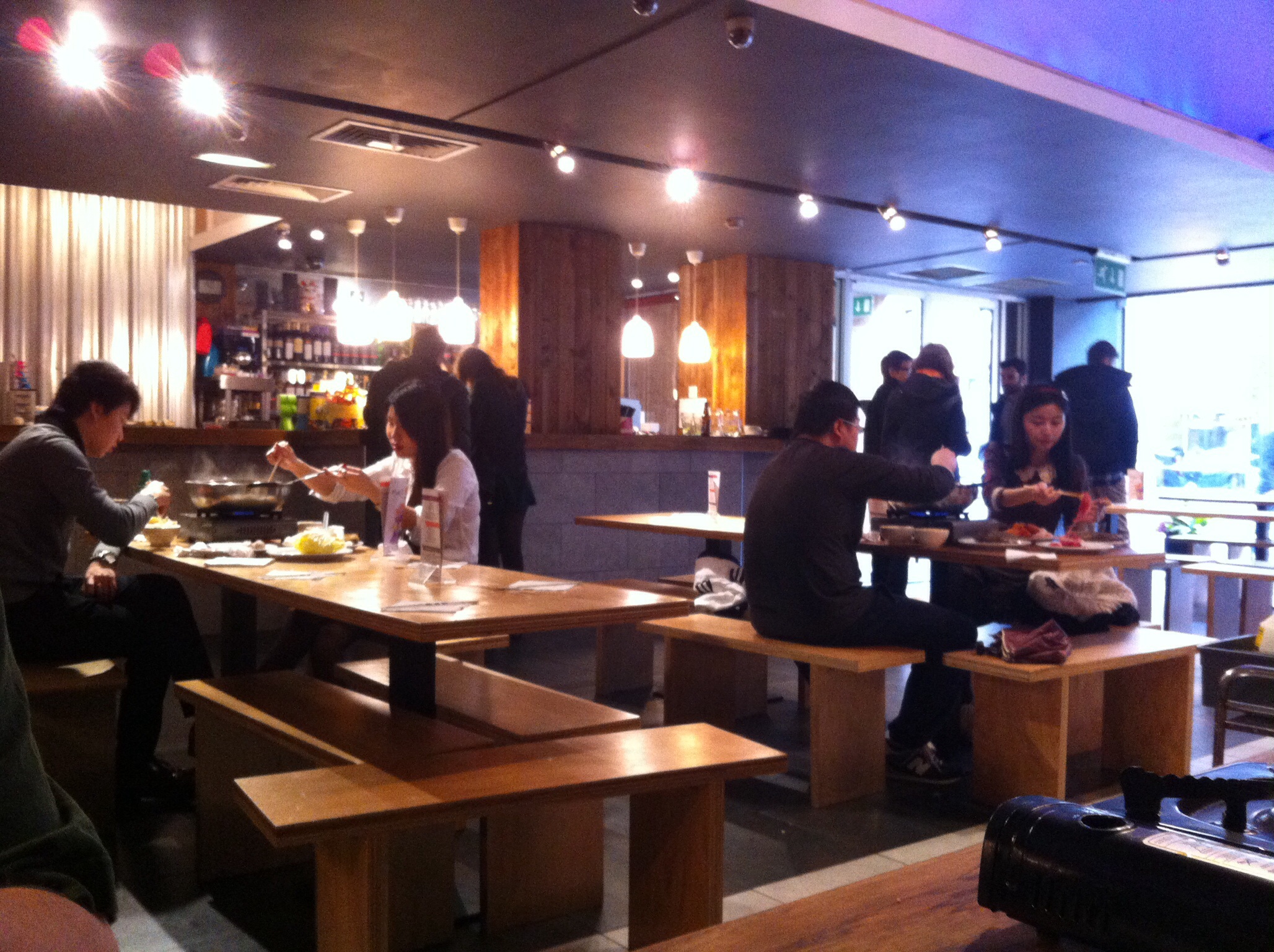 The hot pot area is at the front of the restaurant, pine tables with gas burners at the ready.
