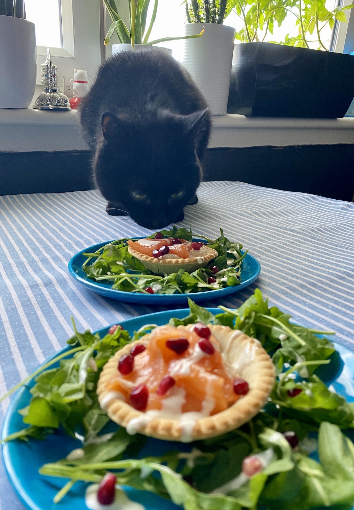 - Smoked salmon mousse tart with pomegranate salad and lemon dressing