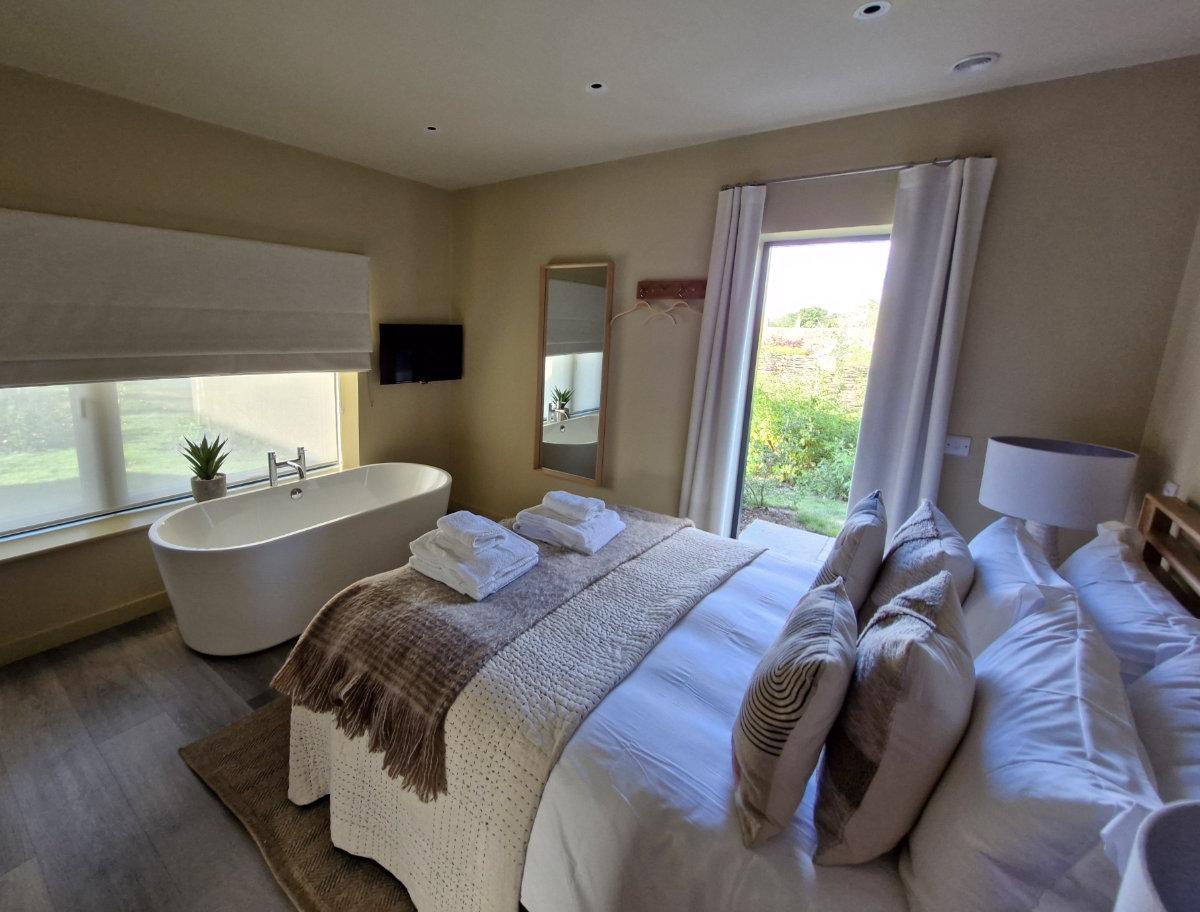 Horslip is named after a long barrow situated on the farm, and it sleeps up to four people. Inside, it has a spaciously designed and tastefully decorated kitchen and living area; two bedrooms; two bathrooms; private garden; and a terrace with a hot tub and outdoor dining area.