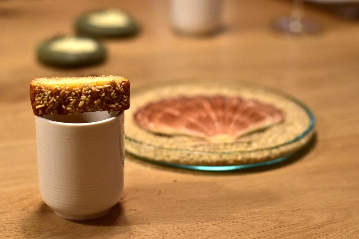 Next came ‘posh prawn toast’ (our words) using scallop rather than prawn. From looking, you could tell that it wasn’t prawn but it still had an aroma like regular prawn toast, while the accompanying consommé had an aroma like haggis, so possibly flavoured by mace? Remember to ‘dook’ your toast in the consommé for extra flavour combos.