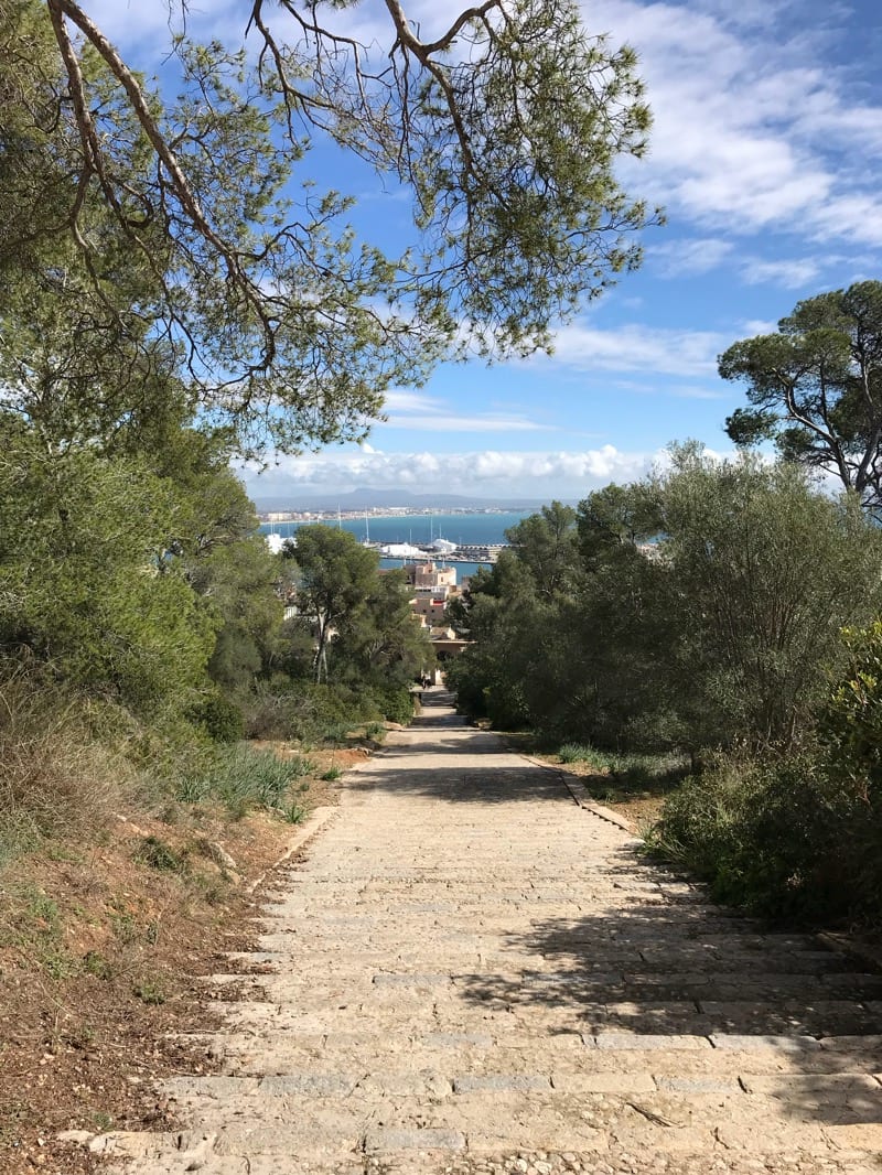The best stop to get off at is 11-Passeig Marítim 33 and then continue walking to the Bahia restaurant and then walk up the stairs onto Carrer dels Germans Schembri and then onto Carrer de Bellver. At the end of this street there’s a lot of steps to walk up so take your time but it should take no more than 20 minutes to walk up to Castell de Bellver (including time stopping for photos). Here’s the view looking down the steps from near the top.