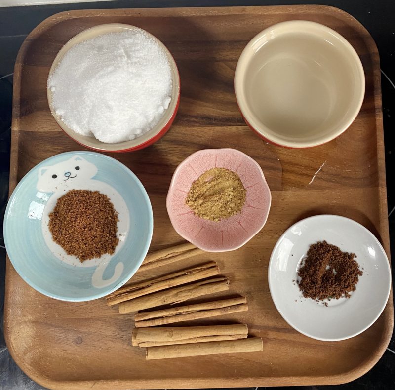 - Once the sugar has dissolved, add cinnamon sticks, ground cloves, ginger, nutmeg and pumpkin puree.