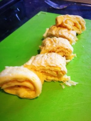 Roll up the omelette like a cigar. Eat the omelette like this or cut into smaller pieces.