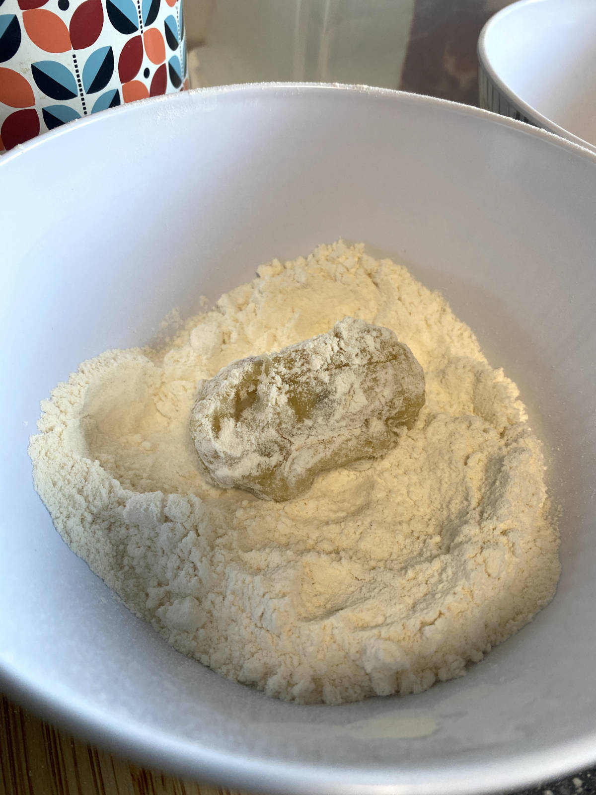 - Take one of the croquettes, cover in flour, then egg, then breadcrumbs.