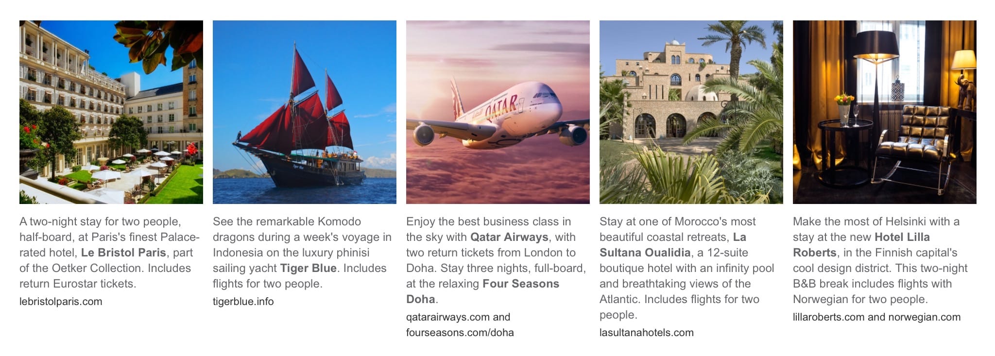 Complete the survey, on this page and you could win a fantastic prize. There are 20 once-in-a-lifetime experiences, from Indonesia to Italy, Morocco to Qatar and Cornwall to the Cotswolds, courtesy of the luxury travel consultancy Perowne Charles Communications (PCC).