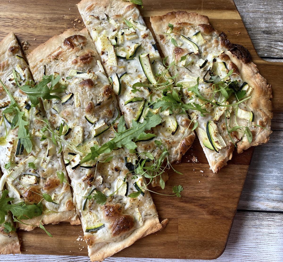 If you are searching on the internet you may even find it referred to as ‘French pizza’, not to be confused with a French bread pizza of course. Despite the differences in regional name, essentially they all translate as a ‘pie baked in flames’ due to the dish traditionally being cooked in a wood-fired oven, just like pizza. Like pizza, Flammkuchen can also be circular or rectangular in shape, but it differs in that it has a thinner, crispier base, covered with fromage blanc or crème fraîche rather than a tomato-based sauce. For this recipe we are using vegan cheese, but you could of course use crème fraîche or cream cheese for a non-vegan version.