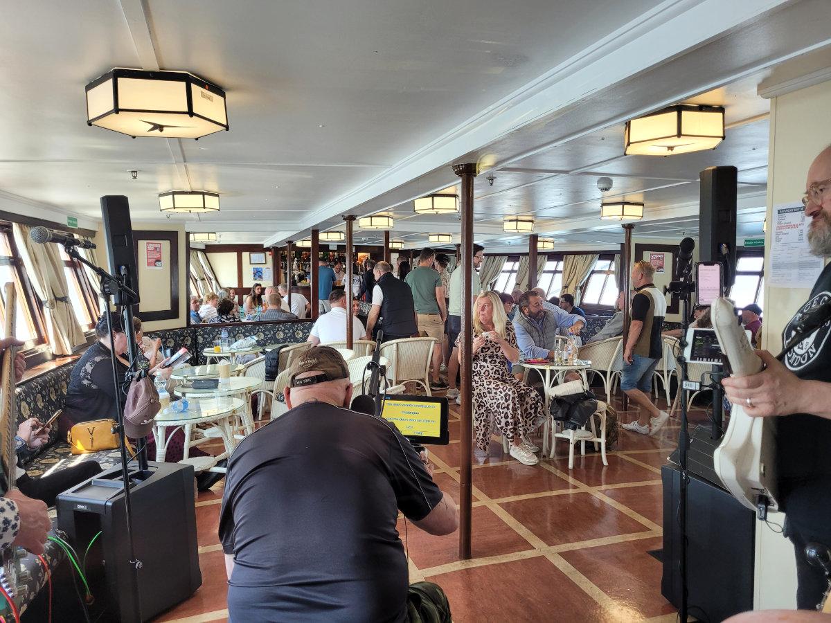 If sitting watching the scenery passing by doesn’t chill you out enough, then wander inside to the two bars. The main bar downstairs had a band playing on our trip. The dance floor, funnily enough, got busier further into the journey! There is also a smaller bar on the floor below this, which is accessed by a set of stairs at the entrance to the dining saloon.