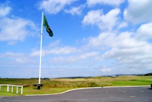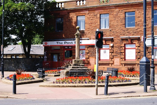 Prestwick Cross with the inscription “Prestwick Mercat Cross Rebuilt 1777”. Its original location was further into the road; it was moved to enable easier traffic movement. The Post Office behind dates from 1927. You will also pass the Red Lion bar, which was the founding place in 1851 of the Golf Club of Ayrshire, the forerunner of Prestwick Golf Club.