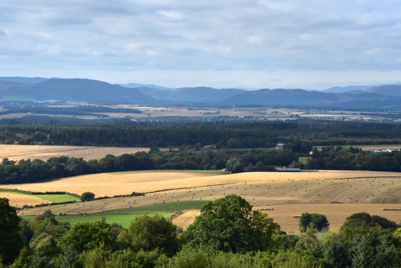 From here the views look over rolling hills in Perthshire towards the mountains of (we think) Ben Vorlich and Ben Chonzie.