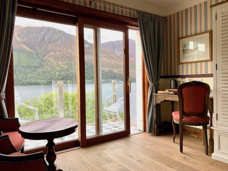 Our room with a view had a loch-side balcony with two chairs. Also included in the room was a selection of tea, coffee and hot chocolate; two bottles of Highland Spring water; a large flat screen TV; an iron / ironing board; a hairdryer; and a safe.
