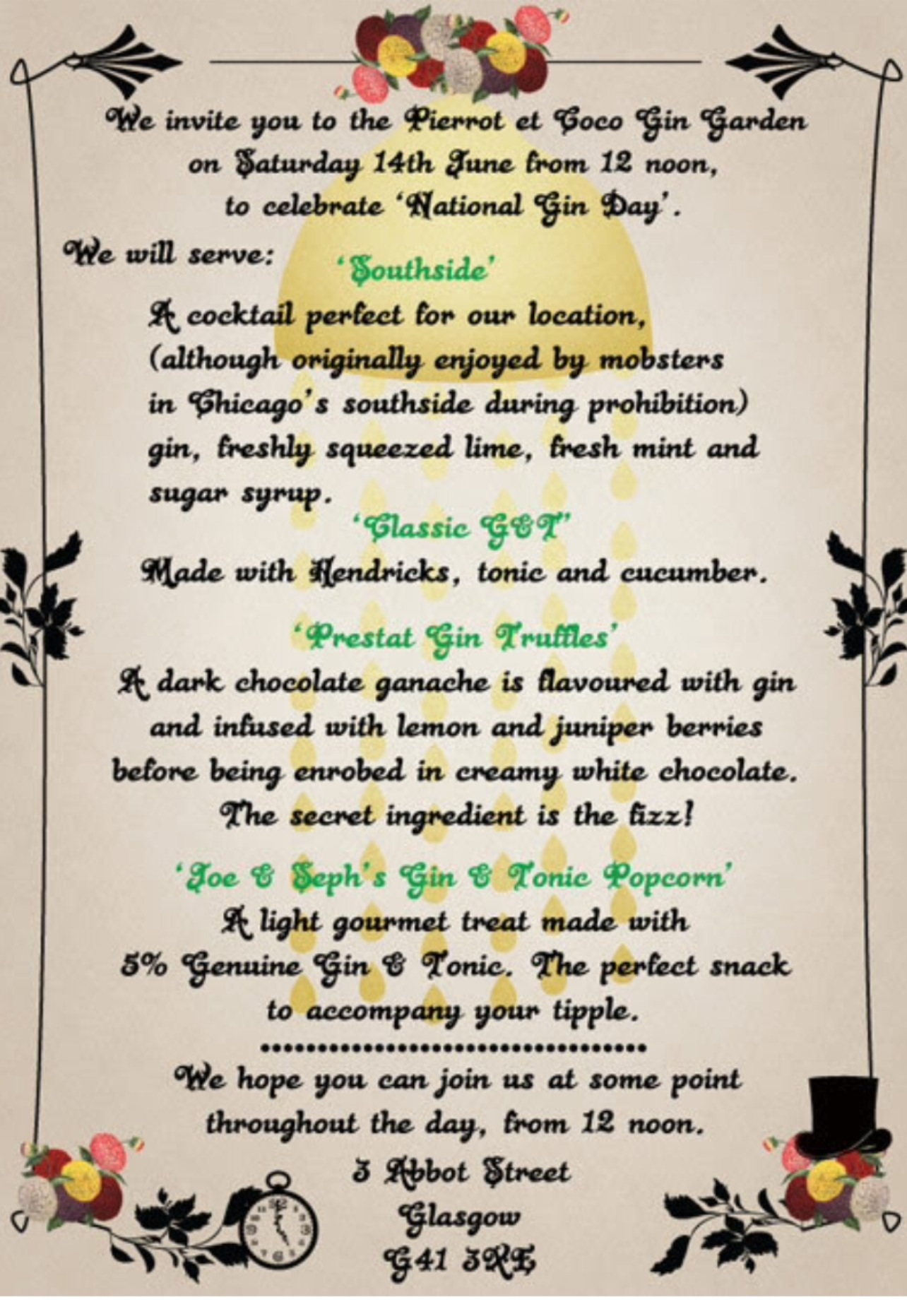12 June 201412 June 2014Glasgow World Gin Day at Pierrot et Coco in Shawlands Emma Leave a Comment on World Gin Day at Pierrot et Coco in Shawlands Celebrate World Gin Day This Sat 14th June at Pierrot et Coco, 3 Abbot Street, Shawlands, Glasgow from noon. This shop is an aladins cave of amazing things, from tea to perfume to jewellery. A recommended visit.